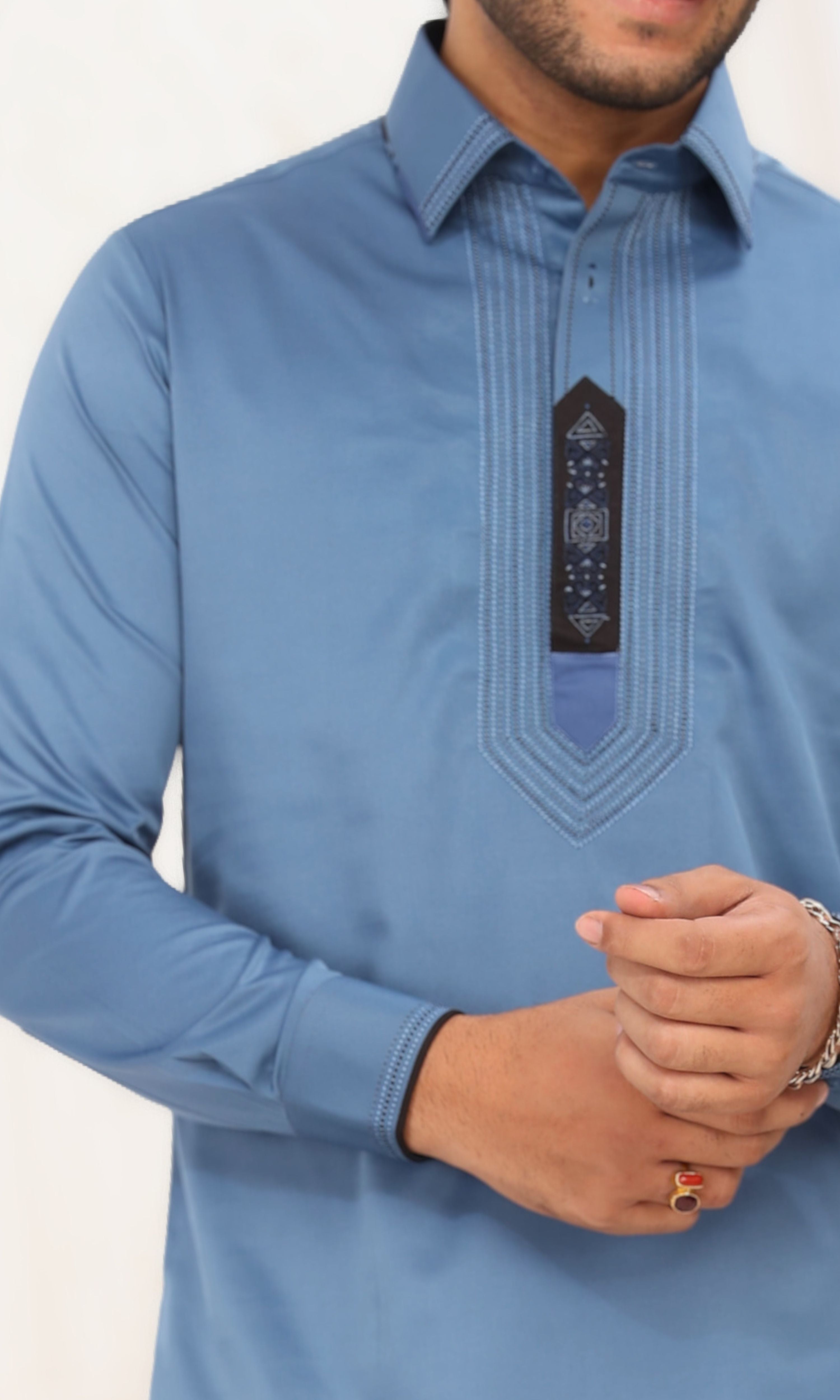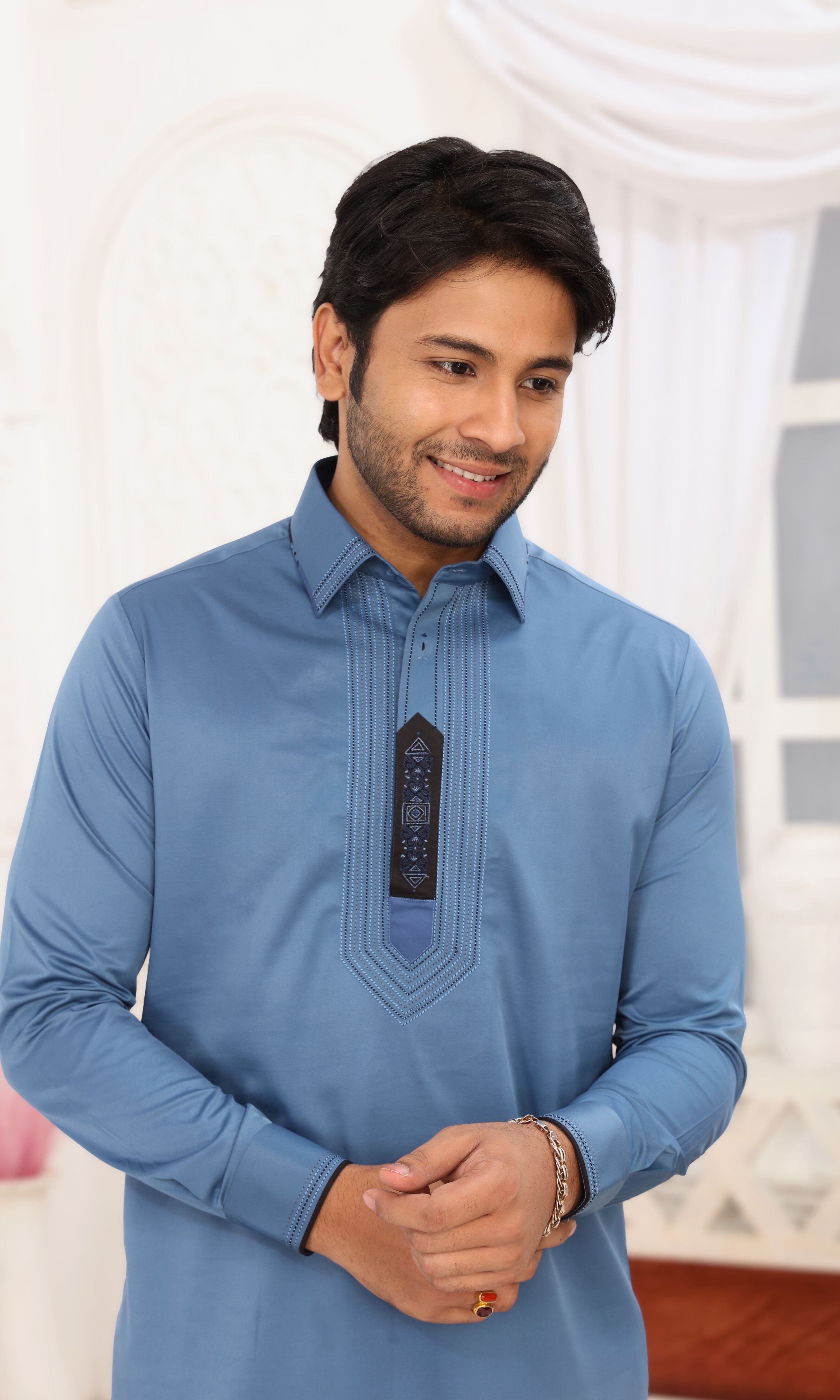 Upgrade your ethnic wardrobe with this elegant Men’s Kurta & Pant Set – Style 4829, crafted for everyday sophistication and festive comfort. Designed in a soothing blue tone, this kurta features fine thread embroidery and neat piping work on the collar, cuffs, and front patti, adding a refined handcrafted touch.